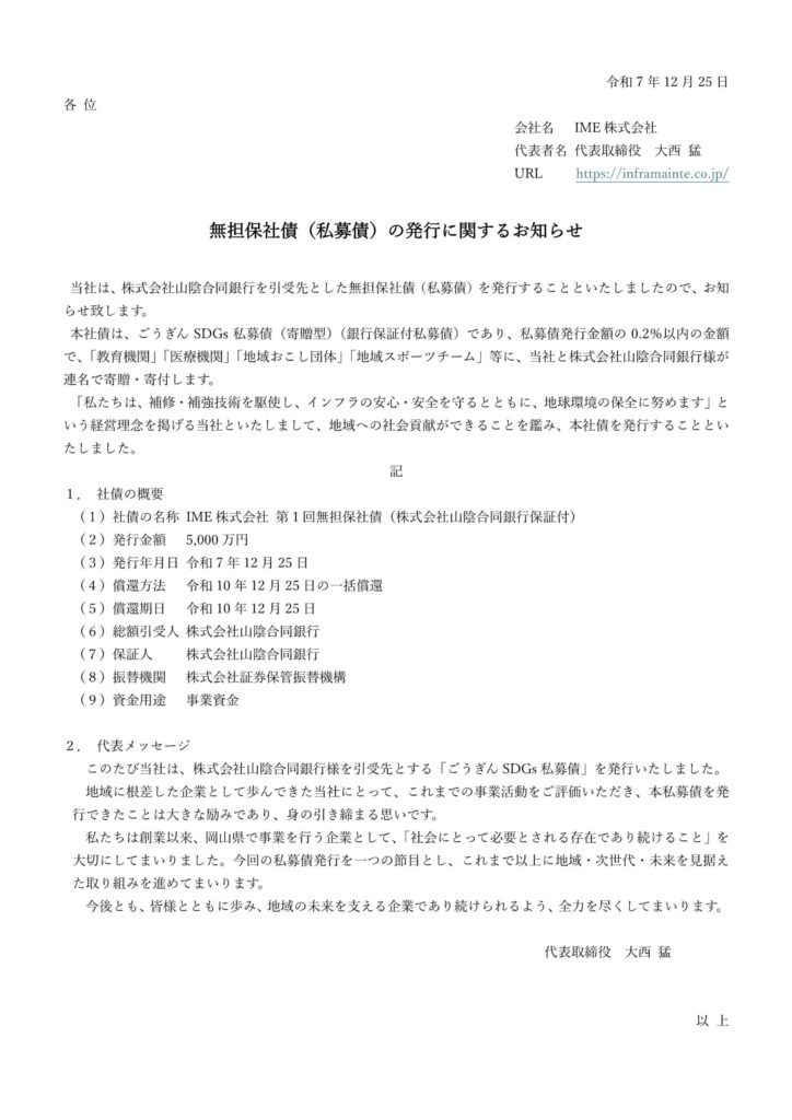 この度、IME株式会社は、2025年12月25日付で株式会社山陰合同銀行様を引受先とする